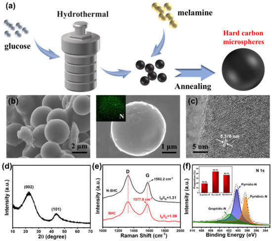 The (a) schematic of the synthesis process, (b) SEM images and EDS element mapping of as-prepared N-SHC, (c) TEM image, (d) XRD pattern, (e) Raman spectra and (f) high-resolution XPS spectra of nitrogen in N-SHC.