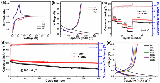 (a) CV curves and (b) charge-discharge profiles of the N-SHC electrode. Compared (c) rate performance and (d) long-term cycle properties at 200 mA g−1 for N-SHC and SHC electrodes. (e) Corresponding charge-discharge profiles of N-SHC at 200 mA g−1 after various cycles.