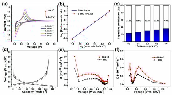 where i is the peak current, v is the scan rate, and the calculated a and b are adjustable parameters [39]. In particular, the storage behavior can be reflected by parameter b; when b is close to 0.5, the K+ ion’s storage behavior is dominated by the diffusion process; and when b approaches 1.0, the capacitive process predominates. The b-value could be determined by the slope of the plotted log(i)−log(v) curve [40]. In this case, as displayed in Figure 3b and Figure S5, the b-values for N-SHC and SHC are calculated as 0.608 and 0.527, respectively, indicating that the diffusion process predominates in the K+-ion storage behavior. Furthermore, the capacitive contribution fractions could be distinguished based on Equation (3):