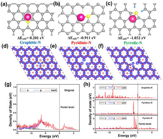 The DFT illustrations of adsorption energy of K ions (set adsorption energy at original hard carbon as 0 eV) and differential charge densities in (a,d) graphitic-N, (b,e) pyrindic-N, and (c,f) pyrrolic-N defects. The density states of (g) original hard carbon and (h) various defects of N−doping hard−carbon materials.