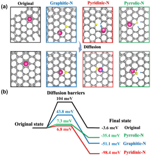 To further solidify the improvement of diffusion kinetics in N-doping hard-carbon materials, we assessed the K+ ions’ migration barriers in the situation of K+ ions across N-doping defects (Figure 5). Original hard-carbon material displays the largest K+-ion migration barrier of 104 meV and lowest diffusion thermodynamics of −3.6 meV, which should be responsible for the sluggish rate capacity of the SHC electrode. In comparison, when the K+ ions passed through the hard-carbon structures with graphitic-N, pyridinic-N, and pyrrolic-N defects, the migration barrier of K+ ions was simulated to be 43.8, 7.3, and 6.8 meV, respectively. Obvious decreases in the K+-ion migration barriers induced by N-doping appeared, particularly in the pyridinic-N and pyrrolic-N defects. This promoted the diffusion of K+ ions between adjacent C layers more easily. Additionally, the diffusion thermodynamics across graphitic-N, pyridinic-N, and pyrrolic-N defects were calculated as −51.1, −35.4, and −98.4 meV, which revealed a stronger driving force for K+-ion migration. Those simulation results could explain the better rate capacity delivered by N-doping the N-SHC electrode.