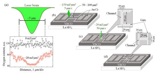 Joule heat due to light absorption-initiated oxygen diffusion from the illuminated areas of the film, resulting in a residual oxygen content δ > 0.6 and completely ruining superconductivity and ensuring electrical isolation of the test sample from the rest of the superconducting film. The reference sample (Figure 1b) was used for reference purposes.