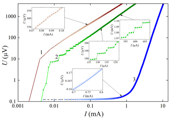 Due to the introduction of partially deoxygenated structures into YBCO devices, the critical current density Jc~2 × 104 A/cm2 measured in the reference sample decreased by more than three orders of magnitude to 9 A/cm2 and 2.7 A/cm2 in samples 1 and 2, respectively. In sample 2, the decrease in the critical current density is accompanied by the appearance of voltage steps (curve 2 in Figure 3). The stepped-like I–V characteristic was observed only in a narrow temperature range between 85.9 K (0.94·Tc) and 89.6 K (0.98·Tc) of YBCO and up to the 110th step (the resolution limit of the measurement setup). No voltage steps in the measured current range were observed in the I–V characteristics of sample 1 and the reference sample.