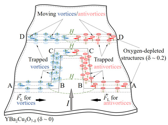 It should be noted that stepped I–V characteristics were observed only in sample 2 (Figure 1d) containing a rectangle (10 μm × 30 μm) line structure. At I > Ic, a rectangle of mixed state material produces a ~40 μm wide and ~10 μm wide bottleneck for the bias current in samples 1 and 2, respectively. The higher current density in the bottleneck results in a stronger magnetic field, which penetrates in the form of vortices/antivortices AB, BC, and CC segments (Figure 4) of the partially deoxygenated rectangle line and straight line (DD) structures. Therefore, the vortices appear to be more strongly squeezed in the central part of the structure, and, in the segment, CC ones can move only along a narrow pathway towards their annihilation line.