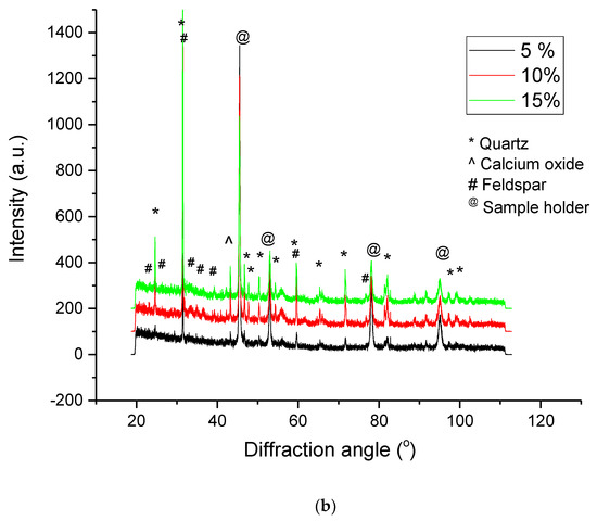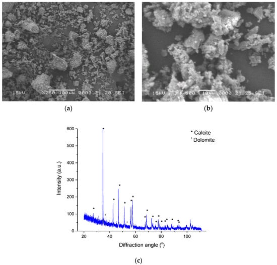 The X-ray diffraction pattern (Figure 1c) shows that limestone waste mostly contained calcite and some traces of dolomite. An X-ray diffraction peak shift was observed due to the differences in ionic radii between the main element (calcium) and the other coexisting elements.