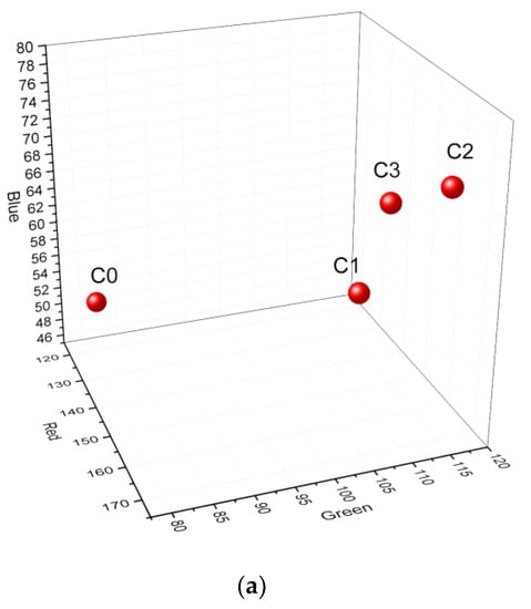 For the description of the color changes due to the presence of limestone waste, the most employed color space (the RGB color space) was used. The RGB color space is based on the mixture of three primary, reference colors: red, green, and blue (R, G, and B). They form the base vectors of a three-dimensional orthogonal (color)–vector space, where the origin represents black because any color can be viewed as a mixture of the three. The three components are determined by the measured intensities of visible light in the long-wave (red), middle-wave (green), and short-wave (blue) area. As shown in Figure 3, which represents the samples color in the RGB space, increases in the green and blue components were recorded, so the color was lighter than that of the reference sample.