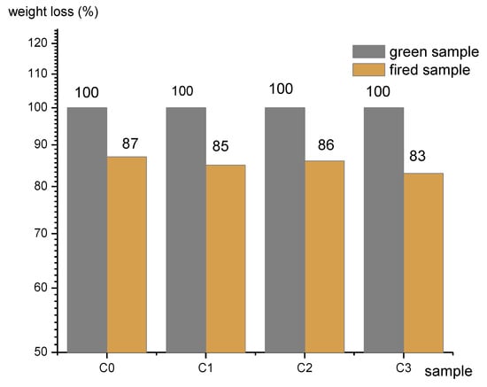 The masses of the green and fired samples are shown in the Figure 5. Up to 17% mass loss on firing was measured in the sample with highest content of limestone (C3), which occurred due to the thermal decomposition of inorganic substances of raw materials.
