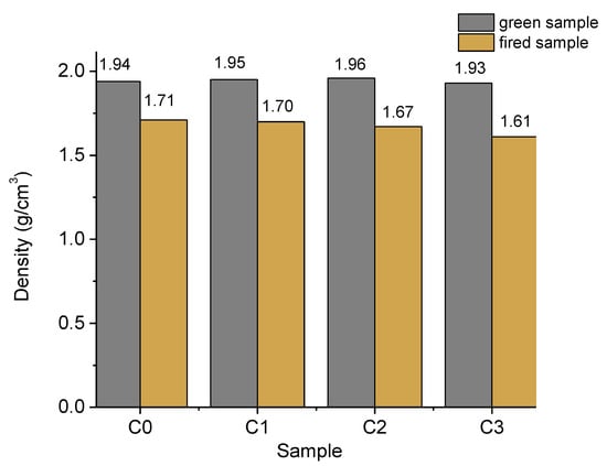 The densities determined for green and fired samples are presented in Figure 7. It is shown that the green samples’ densities had insignificant increases of 1.03% (sample C2) and 0.52% (sample C1), as well as a decrease of 0.52% (sample C3) compared with the reference sample (sample C0). After firing, the density of the samples decreases from 12% in the reference sample and up to 17% in sample C3. It may also be observed that the sample density of fired bricks with the highest percent of limestone waste (C3) experienced a decrease of about 6% compared with the control sample (C0). Because the densities of the raw materials were close, their decreases are attributed solely to the increase in porosity by carbonate decomposition.