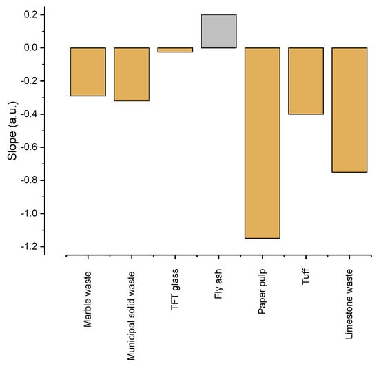 In order to compare the magnitude of the reduction in the compressive strength, the slope of the linear regression of the data presented in Figure 9 [28,35,36,37,38,39] was compared with the data in the literature of other commonly used waste. The positive slope indicated that the waste increased the compressive strength. As can be observed, only the fly ash had a positive effect on the compressive strength. The limestone waste had the largest negative effect. We suggest that the maximum amount of limestone waste to be used in combination with the high CO2 emissions is around 5%.