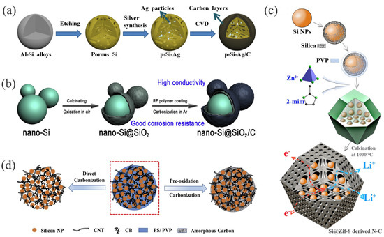 Coated Si−C composites are obtained by depositing different carbon materials (e.g., graphite [83], graphene [84], carbon nanotube [85], etc.) on the surface of silicon nanoparticles. Due to the limited volume expansion, the carbon layer mitigates silicon’s volume expansion and reduces the stress, which improves the structural stability and stabilizes the formation of SEI. This effectively improves the electrochemical performance and battery life.