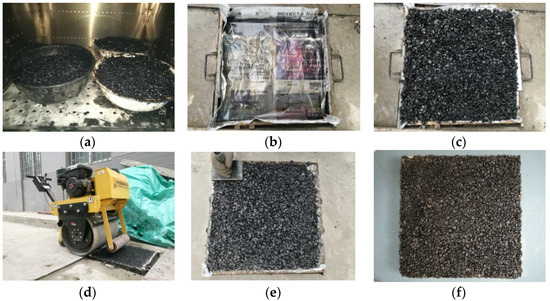 Preparation of asphalt mixture specimens with the dimensions of 500 mm × 500 mm × 50 mm: (a) mixed asphalt mixture; (b) specimen mold; (c) add asphalt mixture to the mold; (d) compaction process; (e) corner handling; (f) asphalt mixture specimen.
