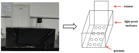 A flatbed scanner with a resolution of 1200 pix/inch was used to obtain section images of asphalt mixture specimens. Different external light sources would lead to distortion of the collected image, so a light-proof enclosure was used to cover the scanner to reduce the error caused by external light sources, as shown in Figure 3. The obtained specimen section image was shown in Figure 4.