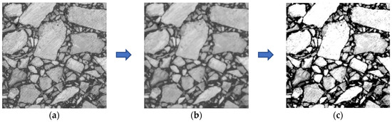 Firstly, the original image acquired by the scanner was grayed with the rgb2gray function in MATLAB, as shown in Figure 5a. In view of the fact that median filtering could better retain irregular edge information of the image while filtering out noise, median filtering was selected to eliminate noise generated in the process of image acquisition, as shown in Figure 5b. In order to distinguish asphalt mastic, air voids and aggregate better, gray-scale transformation was used to enhance the contrast of the aggregate and the asphalt mastic, as shown in Figure 5c.