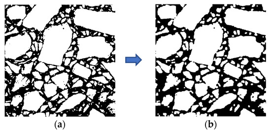 As can be seen from Figure 5a, asphalt mastic and air voids were close to black, and aggregate particles appeared gray and white. The gray histogram of asphalt mixture had a very obvious bimodal characteristic, as shown in Figure 6. The region to the right of the axle represented aggregate particles, corresponding to a larger gray value; thus, the threshold method could be used to segment the image. After thresholding, the image was segmented into two parts: the aggregate part and the other part, while the other part included asphalt mastic and air voids. Considering that the maximum inter-class variance method (i.e., OTSU) was time-saving and accurate [29], the maximum inter-class variance method was adopted to segment the section image of asphalt mixture, as shown in Figure 7a. After the above treatment, it could be seen that although most aggregate particles were separated, some aggregate particles were still not completely separated, and a few aggregate particles exhibited the “pockhole” phenomenon. In order to eliminate the phenomenon of aggregate adhesion and local holes, opening operation was performed to break the narrow connection, and closing operation was adopted to fill the tiny holes, as shown in Figure 7b.