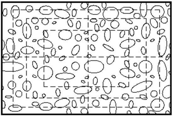 For homogeneous asphalt mixture specimens, the total area of coarse aggregate particles contained in the section of the same area are equal. The particle area was taken as the evaluation parameter of aggregate distribution characteristic in each region of the image, and the variation coefficient of the sum of coarse aggregate particle area in each region could be calculated according to Equation (9).