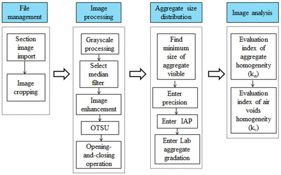 In recent years, digital image processing (i.e., DIP) technique has developed rapidly in the field of road engineering and has been applied to the quantitative evaluation of the homogeneity of asphalt mixture [11,12,13,14,15]. Different from the traditional method of indirectly evaluating the homogeneity of mixture by density of asphalt mixture, percent air voids and texture depth, the homogeneity of asphalt mixture can be directly characterized by its morphological characteristics using digital image processing technique.