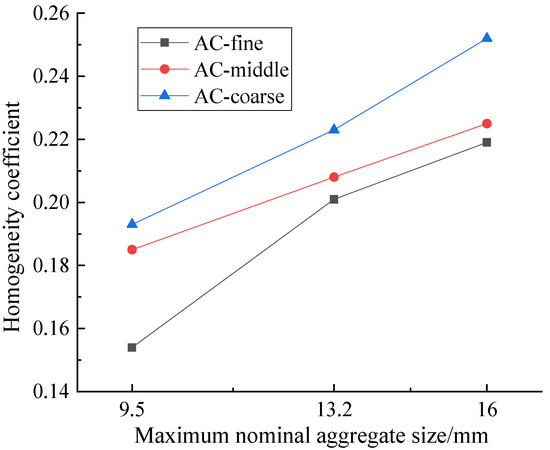 The data listed in Figure 12 shows that with an increase of nominal maximum aggregate size, the homogeneity coefficient increased, indicating that the homogeneity of asphalt mixture became worse. On a good-to-bad scale, the sequence of homogeneities given in Figure 12 can be rated as AC-10, AC-13 and AC-16, which could be attributed to the amount of coarse aggregates in asphalt mixture. For example, the passing percentage of 4.75 mm sieve size in AC-10 middle, AC-13 middle and AC-16 middle were 60%, 53% and 48%, respectively; that is, the mass percentage of coarse aggregates in total aggregate particles were 40%, 47% and 52%, respectively. Compared with coarse aggregate particles, the aggregate with smaller particle size could be more evenly distributed in the asphalt mixture, so AC-10 had better uniformity, vice versa.