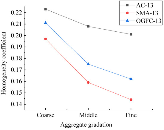 In order to explore the influence of aggregate gradation on the homogeneity of an asphalt mixture, the homogeneity coefficients of asphalt mixture specimens numbered 7–15 in Table 2 were analyzed. The results are shown in Figure 13.