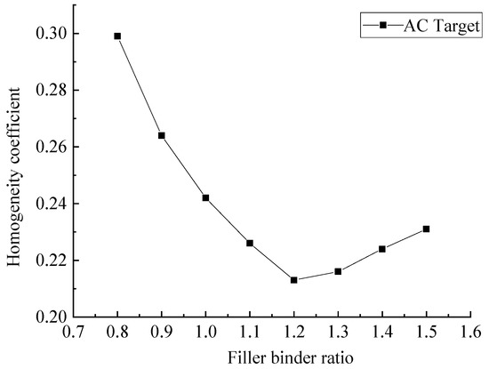 Figure 14 shows that with an increase of filler–binder ratio, namely the decrease of asphalt content, the corresponding homogeneity coefficient shows a concave parabola trend. That is, the homogeneity of the asphalt mixture first became better and then became worse, and the corresponding homogeneity of the asphalt mixture was optimal when the asphalt content was near the optimum.