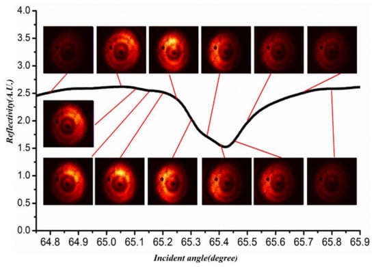A Fourier-transformation-based beam propagation method was applied to simulate the transmitted light pattern of the Gaussian beam during excitation of a specific UOM. In Figure 3, the resonance dip around an incident angle of 64° was calculated by the transfer matrix method [], and the light pattern examples at six different incident angles are simulated and displayed in Figure 3a–f, whilst the corresponding incident angles are marked out as black dots on the reflection curve. Figure 3a shows that the reflectivity is close to unit and the UOM is not coupled. Therefore, most energy is reflected, and the beam pattern is not distorted. Figure 3b illustrates beam stretching as the incident angle approaches the resonant angle. In Figure 3c,d, an M-line appears at the beam center and its position is fixed. If the beam position is defined with reference to its intensity peak, an abrupt positive shift can be predicted since the right peak intensity is higher than the left peak intensity. In Figure 3e, the fixed M-line gradually disappears resulting in the merger of the separated two parts as the incident angle passes the resonant angle. An abrupt negative shift can be predicted as the left peak intensity exceeds the right peak intensity. Note that there are still two peaks in Figure 3e, so the lateral shift is not continuous since neither peak moves continuously across the beam cross-section. For example, in Figure 3f, as the incident angle is further away from the resonant angle, the shape of the beam gradually returns to a Gaussian beam.