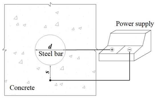 In order to further improve the built-in auxiliary electrode method, stainless steel wire with a small section area, instead of a stainless steel rod, is placed near the reinforcement in the concrete cover as the auxiliary electrode. The steel bar is used as the positive electrode of the anode and the stainless steel wire is used as the negative electrode connected to a DC power supply. Because the electron transport rate is much faster than the cathode reaction rate, a large number of electrons will gather around the cathode, resulting in an electron-rich phenomenon. The cathode area is much smaller than the anode area, and the distance between the two electrodes is close. Due to the effect of the Coulomb force, the closer the anode is to the cathode, the greater the Coulomb force is, and the electron is preferentially lost due to the repulsion force. The metal cations preferentially enter the solution due to the force; so, the steel bars show non-uniform corrosion. The schematic diagram of the non-uniform corrosion method is shown in Figure 1. The diameter of the stainless steel wire is 0.8 mm; the diameter of the steel bar is designated as d; and the net distance between the steel bar and the stainless steel wire is designated as s. The parameters s and d are important because they can affect the thickness distribution of the rust layer on the surface of the steel bar.