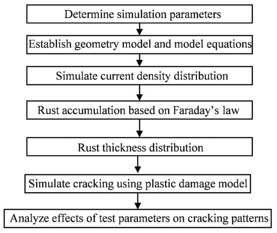 In order to explore the influence of the diameter of the steel bar and the net distance of the two electrodes on the current density distribution of the steel bar surface under the non-uniform corrosion method, finite element simulation is used to analyze the process of the electric corrosion of the steel bar by COMSOL Multiphysics software. The flowchart of the modeling work is shown in Figure 2. In Equations (5)–(8), parameters α and β, i0a and i0c are related to the chemical reaction conditions, which can be determined by experimental methods, and E0a/c can be calculated by the Nernst equation. The corrosion current density of the two electrodes can be determined by the polarization potential of the two electrodes. Based on the above experimental environment and electrochemical analysis, the electrochemical parameters used in the model are shown in Table 1. The specimen with concrete C30 (the standard value of concrete strength was 30 MPa) was studied. The specimen was immersed in a 3.5% sodium chloride solution for three days, and a sponge coating with a sodium chloride solution was used to cover the specimen during the electrification process to ensure that the specimen was filled with solution. According to the existing experimental studies, when the current density is less than or equal to 3 A/m2, the test results of the rust expansion cracking of the reinforced concrete are closer to those under a natural exposure environment []; so, the average current density of the reinforcement is 3 A/m2.