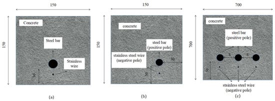 The electric corrosion process of concrete specimens with a single steel bar in the middle of one side (Figure 3a) or at a corner (Figure 3b) and a single row of multiple steel bars (Figure 3c) is simulated. The dimensional size of the concrete specimen is shown in Figure 2. The thickness of the specimen is 75 mm, and the thickness of the concrete cover is 30 mm. The steel bar and the stainless steel wire are the anode and cathode, respectively. The specimens in Figure 3a,b are used to explore the influence of the diameter (d) of the steel bar and the net distance (s) between the two electrodes on the current density distribution on the steel surface. The diameters of the steel bars were 8, 12, 16, 24, and 32 mm, and the net distances between the two electrodes were 4, 8, 12, 16, and 20 mm, respectively. For the arrangement of the corner reinforcement, the corrosion medium of the thickness of the protective layers on both sides will reach the surface of the reinforcement at the same time in the process for natural corrosion, and the surface of the reinforcement on one side of the two protective layers will begin to rust at the same time. Therefore, in the simulation process, the stainless steel wires need to be built in the protective layers on both sides, as shown in Figure 3b. When exploring the current density distribution function in the circumferential direction of multiple rebars, the influence of the adjacent rebars on the current density distribution of the tested rebars is mainly explored. The main parameters are rebar diameter d and net distance S between the rebars. In Figure 3c, the middle steel bar is the tested steel bar, and the position of the two sides of the steel bar is changed to vary S. The diameters of the steel bars are set as 8, 12, 16, 24, and 32 mm, respectively. The net distance of the reinforcement is expressed in multiples of d, i.e., d, 2d, 4d, 6d, and 8d.