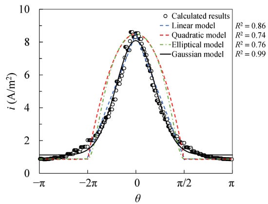 The calculated results of the corrosion current density distribution of the steel bars in the middle of the single side are shown in Figure 4. The results of the circumferential current density are fitted by different formulas, as shown in Figure 4. The comparison shows that the calculation results can be well fitted by the Gaussian function: