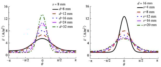 The typical results of the current density around the side bars with different d and s are shown in Figure 5. With the increase in the steel bar diameter, the maximum current density increases, while the minimum current density decreases, indicating that the uneven distribution of the current density increases. As the distance between the steel bar and the stainless steel wire increases, the trend is the opposite. Table 2 lists the fitting values of the parameters in the equation under different d and s. According to the results in Table 2, the relationships y(d,s), Tm(d,s), and c(d,s) between y, Tm, c and d and s are obtained, as shown in Equations (10)–(12), where the unit of s and d is m. Finally, the current density distribution model of the single middle steel bar under the condition of electric corrosion is Equation (13).