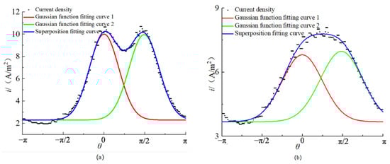 For the electric corrosion of concrete specimens with a single steel bar at the corner, the current flows from the steel bar to the stainless steel wire on both sides, and the current is superimposed on the surface of the steel bar. As shown in Figure 6, when s < d, the fitting results show a bimodal shape; when s ≥ d, the fitting results show a single peak shape. The results in Figure 6 show that the surface current density of a single corner reinforcement can be fitted by the superposition of two Gaussian functions, and the fitting effect is good. The symmetric axes of the two Gaussian functions are θ = 0 and θ = π/2, respectively; so, it is assumed that the distribution of current density is