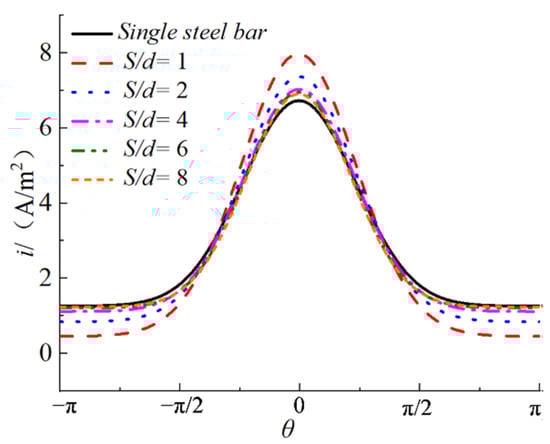 Figure 7 shows the typical results of the variation of the current density distribution on the steel surface with S/d when multiple reinforcements are electrified and corroded (d = 8 mm). It can be seen from Figure 7 that with the increase of S/d, the maximum current density on the surface of the steel bar gradually decreases, and the minimum current density gradually increases. The distribution of the current density is more dispersed and closer to the current density distribution for a single steel bar. In order to describe the difference of the current density distribution between the multiple bar and the single bar, Y, T, and C are defined as the change rates of the uniform coefficient, the non-uniform coefficient, and the expansion coefficient: