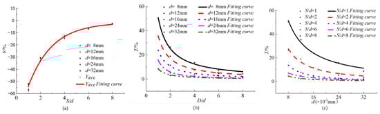 Table 4 shows the three coefficients and their change rates according to the fitting results of the current density distribution of the specimens. It can be seen from Table 4 that the absolute value of the change rate of the expansion coefficient C is less than 5%; so, the influence of the reinforcement spacing on the expansion coefficient can be ignored. The relationship of S/d, d, Y, and T is obtained, as shown in Figure 8. It can be seen from Figure 8a that Y is always negative, indicating that the presence of steel bars on both sides in the process of the power supply will enhance the non-uniformity of the current density distribution of the steel bars in the middle. With the increase of S/d, Y gradually increases to close to 0, indicating that the larger the net distance of reinforcement, the smaller the degree of non-uniformity enhancement. In addition, the data of the same S/d are very close, indicating that d has little effect on Y, which can be ignored. Therefore, we take the average value of the five data under the same S/d as the final value, denoted as Yave. It is found that the relationship between Yave and S/d conforms to the exponential function. The curve in Figure 8a was fitted by Equation (19), where S and d are in m.