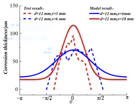 The experimental result of Fu et al. [], based on the non-uniform corrosion method, was used to verify the thickness distribution model of the rust layer proposed in this study. In their test, ordinary Portland cement mortar was used and the embedded steels (the chemical compositions of the steel and cement are shown in Table 5 and Table 6, respectively) were hot-rolled plain bars with a diameter of 6 mm. The non-uniform rust distribution was produced based on the impressed current method. The rust thickness distribution was detected by X-ray microtomography. The comparison between the experimental results and the model results is shown in Figure 9. The experimental results are in good agreement with the model fitting results, and the model results are slightly larger than the experimental results. This is because the current will be lost in the process of concrete transmission, resulting in the actual corrosion rate being slightly less than the theoretical value.