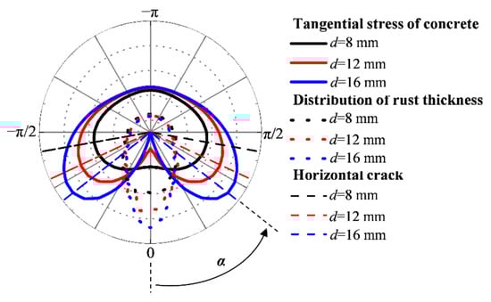 In the case of the other parameters being unchanged, with the increase of the steel bar diameter, the uneven coefficient of the current density increases, while the uniformity coefficient and the distribution coefficient of the current density decrease. In this regard, the larger the diameter, the higher the unevenness of the current density, and the corresponding corrosion thickness around the steel bar is also larger. As shown in Figure 11, with the increase in diameter, the maximum value of the corrosion thickness gradually increases, resulting in a greater tangential stress of concrete and a slight change in the direction of the maximum tangential stress. Therefore, with the increase of the steel diameter, the horizontal crack angle and the critical corrosion degree related to the external surface cracking decrease, as shown in Figure 12. Similarly, when the distance between the steel and stainless steel wire increases, the current density non-uniformity level and the corrosion thickness around the steel bar decrease. It can be seen from Figure 13 that with the increase in distance, the horizontal crack angle and the critical corrosion degree increase.