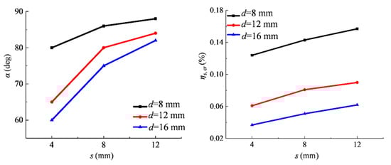 Relationship between angle (α) and critical corrosion degree (ηs, cr) of horizontal cracks and distance (s) between steel bars and stainless steel wires.