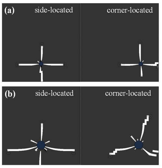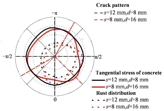 Figure 14 shows the crack distribution of the steel bars at different locations. For side reinforcement, the cracks are mainly distributed in the horizontal and vertical directions in this study. For the steel at the corner, as shown in Figure 14, the crack pattern is changed by changing the relationship between s and d. In the case of s > d (Figure 14b), the number of primary cracks changes, and the cracks no longer propagate horizontally and vertically.