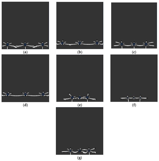 Crack distribution of single central-ribbed reinforced concrete (β = 0): (a) s = 4 mm, d = 8 mm; (b) s = 4 mm, d = 12 mm; (c) s = 4 mm, d = 16 mm; (d) s = 8 mm, d = 16 mm; (e) s = 12 mm, d = 16 mm.