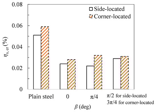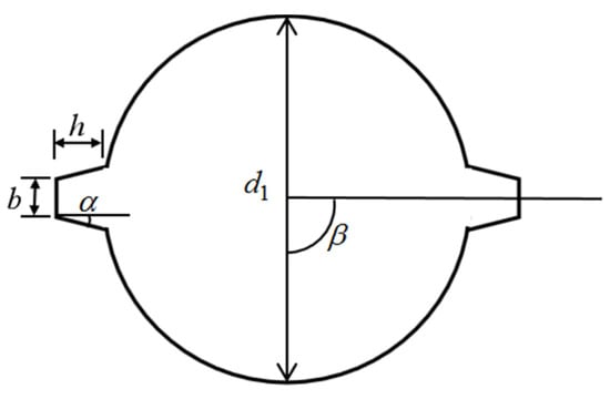 As mentioned in Section 3, the distribution of the current density and the corresponding corrosion thickness depend on the geometric parameters, including the diameter of the steel bar and the distance between the steel bar and the stainless steel wire. By controlling the value of the geometric parameters, the distribution of the rust layer thickness can be designed, thus affecting the cracking behavior of the concrete. In this paper, the effect of the geometric parameters of a steel electrode on the cracking behavior is discussed from two aspects: the horizontal crack angle (α) and the critical corrosion degree (ηs, cr) of the concrete surface cracking.
