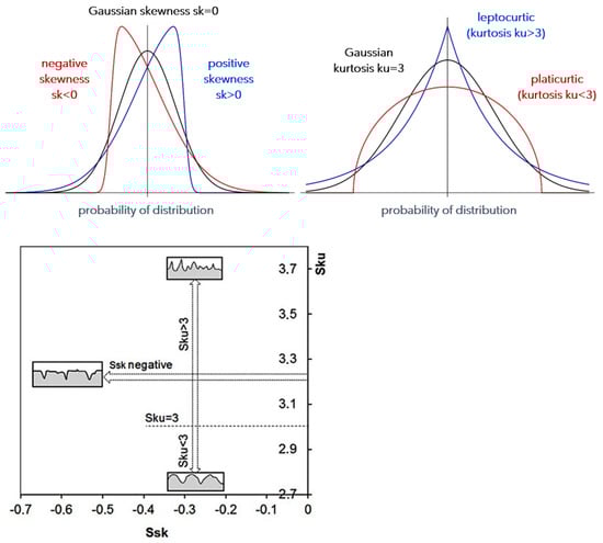 Skewness and kurtosis, as well as graphical interpretation related to the surface geometrical structure and its parameters Ssk and Sku [3].