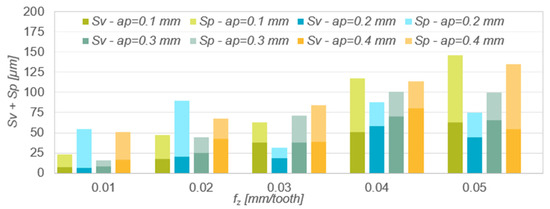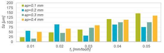 As in the case of the Sa parameter, increasing the feed per tooth fz resulted in a gradual increase in the value of parameter Sz (Figure 4). The exceptions are the results obtained when milling with depth of cut ap = 0.2 mm, for which the change of the feed per tooth did not have a clear effect on the parameter Sz. At low feed fz, the lowest values of the Sz parameter were obtained at the depths ap = 0.1 and 0.3 mm, while at higher feed rates of fz, the lowest roughness height was obtained by using the depths ap = 0.2 and 0.3 mm, respectively.