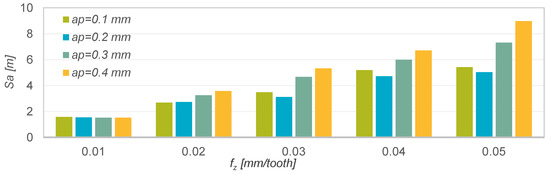 Analysis of the Sa parameter (Figure 3) showed that the lowest and also most similar values (Sa = 1.51–1.57 µm) were obtained in machining with the lowest technological parameters. Continued increasing of the feed per tooth fz resulted in an increase in the value of the Sa parameter. This increase was greater the greater the depth of the cut ap and feed per tooth fz. The exception is ap = 0.2 mm, for which the Sa parameter increase was the smallest.