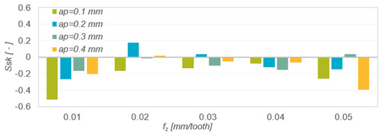 The results of measurements of roughness parameter Ssk as a function of feed per tooth fz and depth of cut ap.