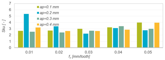 The kurtosis value Sku of the roughness profile (Figure 7) in most cases oscillated around 3, which indicates that the roughness distribution was close to normal. The kurtosis value was independent of the change in feed per tooth and depth of cut. Sku values >3 indicate larger roughness valleys and sharper peaks.