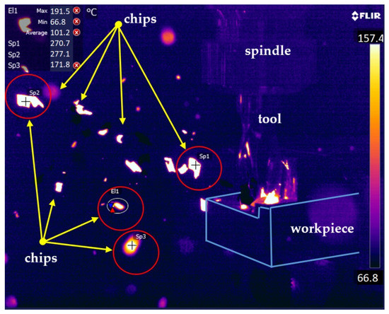 Figure 8 presents an example of a thermal image recorded during the milling of the AZ91D alloy with an HSS tool with marked areas of chip temperature measurement. The characteristic chips, along with the recorded values of their temperature, are marked.