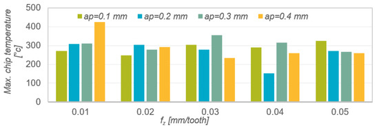 The results of the maximum chip temperature measurement as a function are presented in the form of a graph in Figure 9. When analysing the obtained results, no clear correlation was observed between the change in feed per tooth and depth of cut, and the maximum temperature. The obtained temperature values oscillated around 300 °C. The differences in the obtained results may be largely due to the fact that the chip formation process is a rapidly changing phenomenon.