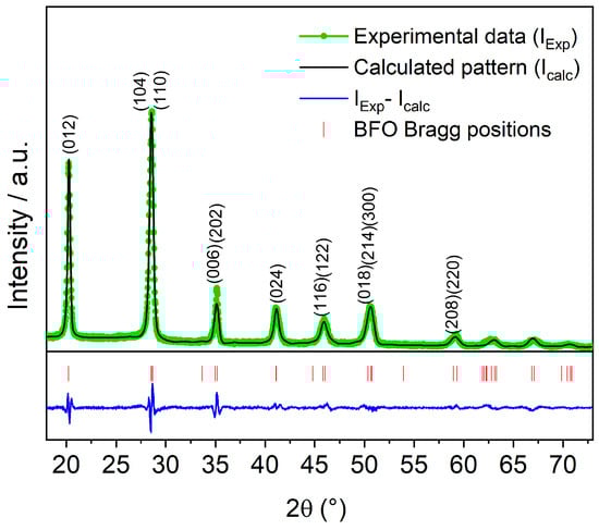 Rietveld refinement plots for the BiFeO film deposited in an argon atmosphere at low pressure (unetched sample). The experimental pattern (green dots), the calculated pattern (solid black line), and the difference between them (blue line below patterns) are shown. The calculated Bragg positions are also shown (vertical red lines).