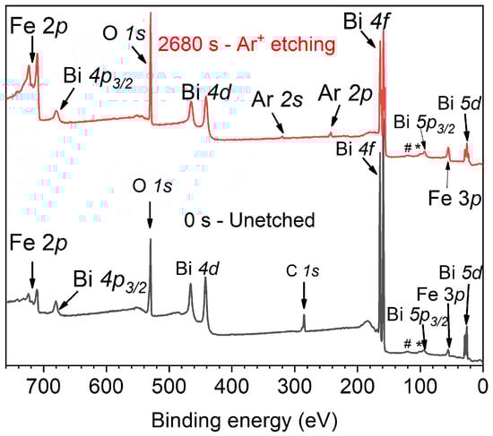 Figure 2 shows survey spectra at 0 s (unetched) and 2680 s of the Ar etching time, with binding energies (BE) ranging from 0 to 760 eV. Both spectra reveal the elements present in BiFeO, further the adventitious carbon C at 0 s (typical in samples exposed to air). For samples etched at 80 s or more, slight argon implantation is observed, exhibited through Ar (319.9 eV), Ar (242.4 eV) and Ar (244.6 eV). As expected, those are more visible in the sample etched for 2680 s. Peaks marked with (#) and (*) correspond to Bi (120.0 eV) and Fe (99.4 eV), respectively. The highest signal from Bi is due to its large cross-section. Eventually, with the etching time, Bi intensities decrease.