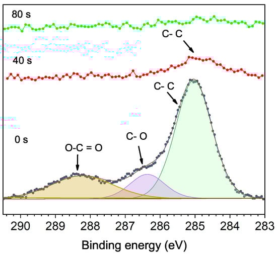 Figure 3 shows the C XPS spectra of the unetched sample and the samples etched at 40 and 80 s. The C peaks correspond to adventitious carbon (AdC), present on all surfaces with air exposure. At 0 s, peaks with a binding energy of 285 eV correspond to C-C bonds, 286.4 eV with C-O bonds, and 288.2 eV with O-C=O bonds. After 40 s, a reduced C-C peak remains, which shifts slightly to 284.7 eV, disappearing after 80 s of etching. The shift of the C-C peak at 40 s and its disappearance after 80 s etching time are why it is not convenient, in this work, to use the C for binding energy correction (charge calibration). Some previous results have already reported issues on the C 1s peak for binding energy correction as a not good reference for the calibration of XPS spectra [19,20,21].
