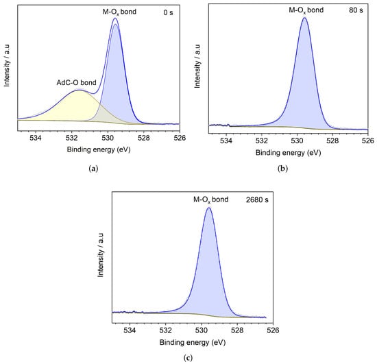 Figure 4 shows high-resolution XPS spectra from core level O , according to etch time at (a) 0 s, (b) 80 s, and (c) 2680 s. Figure 4a shows the XPS spectrum for the unetched BFO film, with a peak at 529.6 eV, corresponding to metal-oxygen bonds (M-O), and a peak at 531.5 eV, corresponding to oxygen bonded with adventitious carbon (AdC) AdC-O [13], confirmed by the etching process as shown in Figure 4b. The AdC-O peak disappears after 80 s of argon etching, and the metal-oxygen peak preserves line shape, binding energies, and FWHM around 1 eV [22,23,24]. The same behaviour occurs even with the high etching (2680 s), as exhibited in Figure 4c, suggesting that in the pure phase BFO, Bi-O, and Fe-O bonds are related to one photoemission at 529.5 eV.