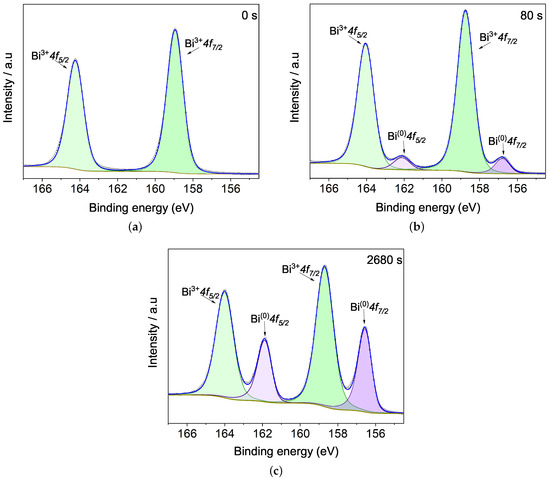 Metallic bismuth, Bi, appears with argon etching time. At 80 s the spectrum shows a doublet metallic bismuth signature (Figure 6b) with BE at eV for Bi and eV for Bi , representing 6.2% photoemissions compared with Bi. After 2680 s of argon etching (Figure 6c), an enhancement in metallic Bi doublet peak intensity was observed corresponding to 33% of atomic concentration. This value agrees with the one exhibited by Bi spectra, showing the Bi-metallic increase in both core levels in a similar proportion.